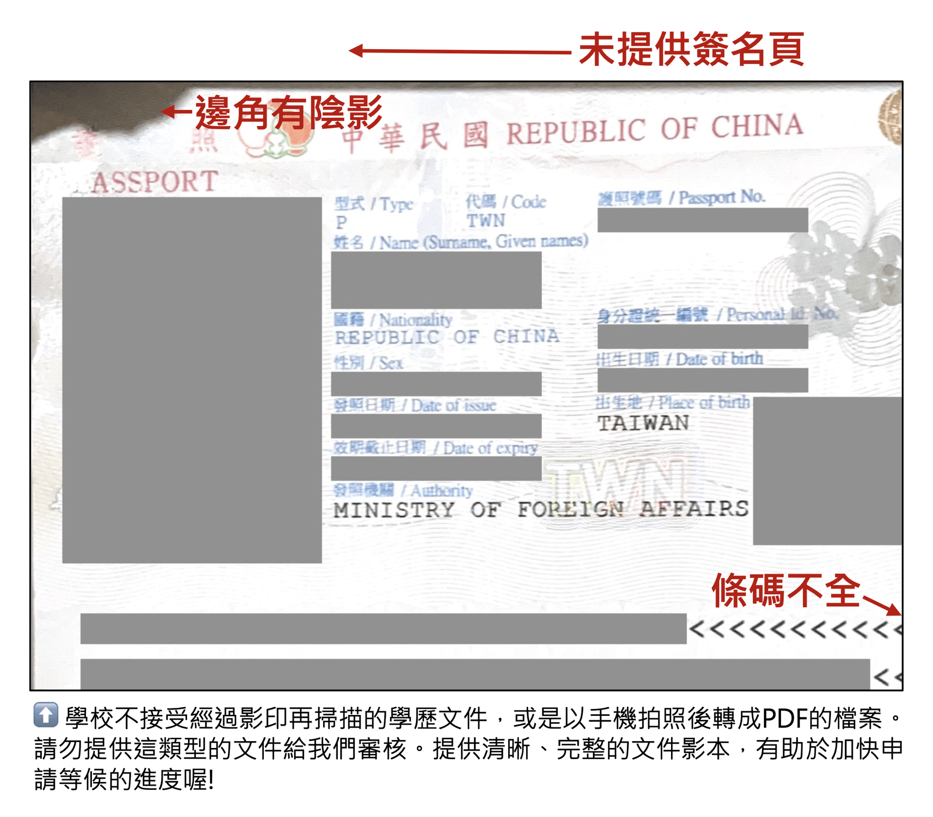 *提醒 ⚠️ 現在大學審核標準嚴格, 不接受影本再掃描的文件, 若提供此類檔案會被退件;同樣地, 將照片檔轉成 PDF 容易導致畫面模糊, 也不被接受。請務必提供清晰且完整的正式文件, 以利申請作業順利進行。