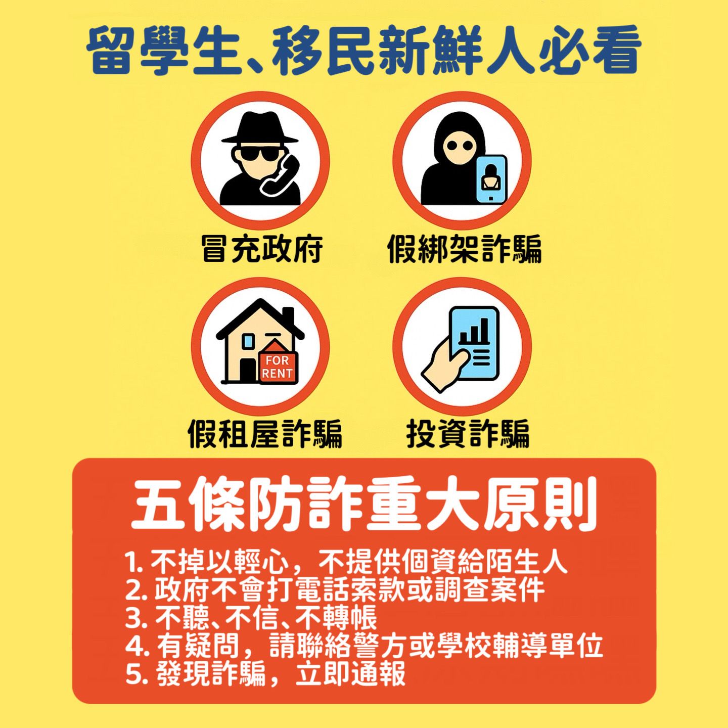 身處異鄉,安全是最基本的保障。若你發現任何可疑情況,不論多小,都值得你停下來思考、查證、並請求協助。如果我們還有未完全的提醒, 請隨時參見澳洲各州官方的遠離詐騙文宣: